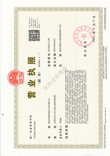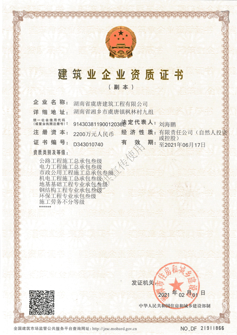 鋼結(jié)構(gòu)專業(yè)承包叁級(jí)、環(huán)保工程專業(yè)工程承包叁級(jí)、承裝(修、試)電力設(shè)施四級(jí)、路面養(yǎng)護(hù)乙級(jí)資質(zhì)、橋梁養(yǎng)護(hù)乙級(jí)資質(zhì)、隧道養(yǎng)護(hù)乙級(jí)資質(zhì)、交通安全設(shè)施養(yǎng)護(hù)乙級(jí)資質(zhì)、施工勞務(wù)不分等級(jí)等多項(xiàng)施工資質(zhì)。